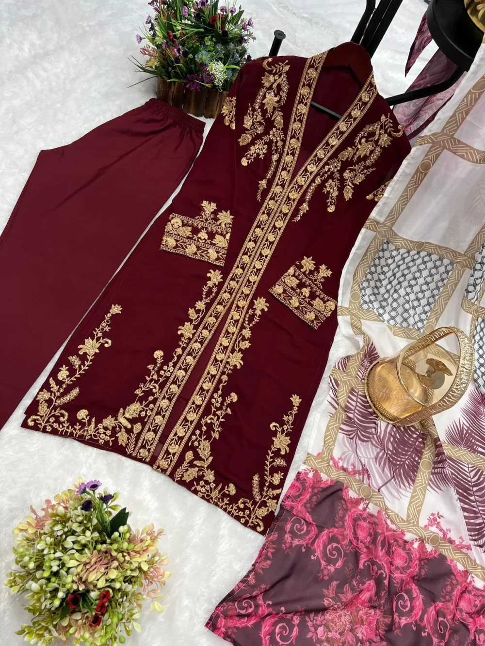 Introducing the elegant embroidered three piece maroon color kurti set with pant and dupatta. Crafted with the finest materials, this outfit is perfect for any occasion, offering both comfort and sophistication.