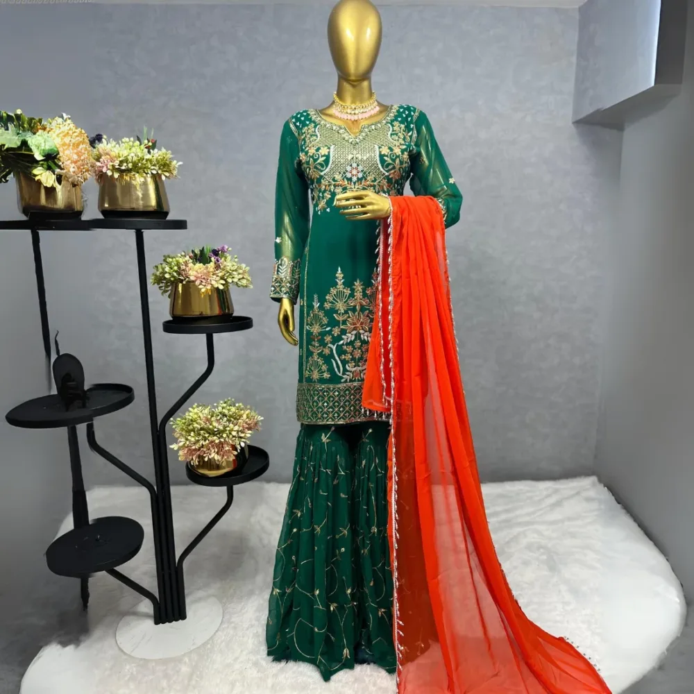 Elevate your style with the Faux Georgette Bottle Green Color Three-Piece Sharara Set with Dupatta By Ardhaangini, designed for those who seek elegance and distinction in their wardrobe. This exquisite ensemble features a beautifully embroidered kurti, a matching sharara, and a contrast dupatta, all crafted to perfection.