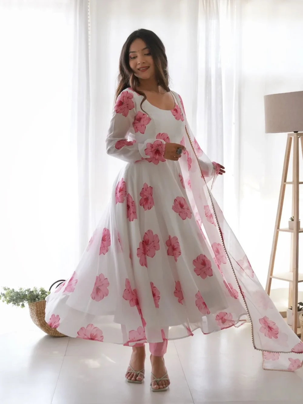 Introducing the latest addition Faux Georgette White Color Floral Print Long Dress with Dupatta by Ardhaangini. This stunning ensemble is perfect for those who love to blend comfort with style. Crafted with premium Fox Georgette fabric, this dress is designed to make you stand out at any event.
