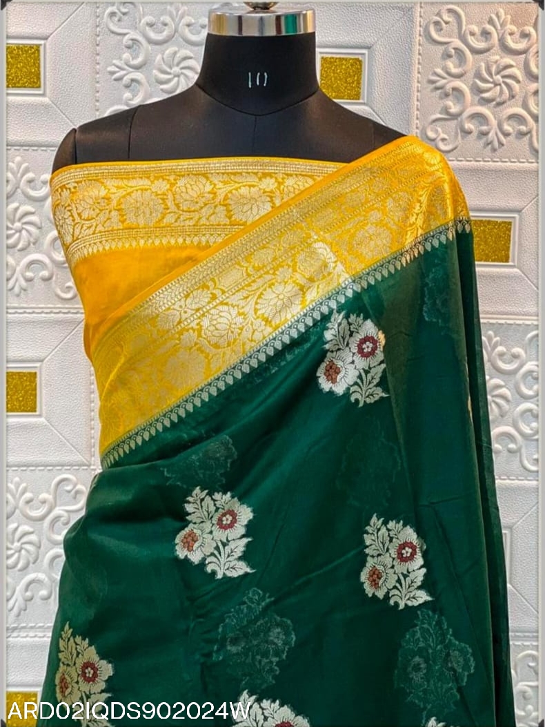 The saree is adorned with an allover zari meenakari buta weaving design, showcasing the intricate craftsmanship that defines Indian textiles. The luxurious zari border and pallu add a touch of grandeur, making this saree an ideal choice for weddings, festivals, or any formal event. The attached plain blouse with a zari border, measuring 0.80 meters, completes the ensemble, offering a polished and refined appearance.