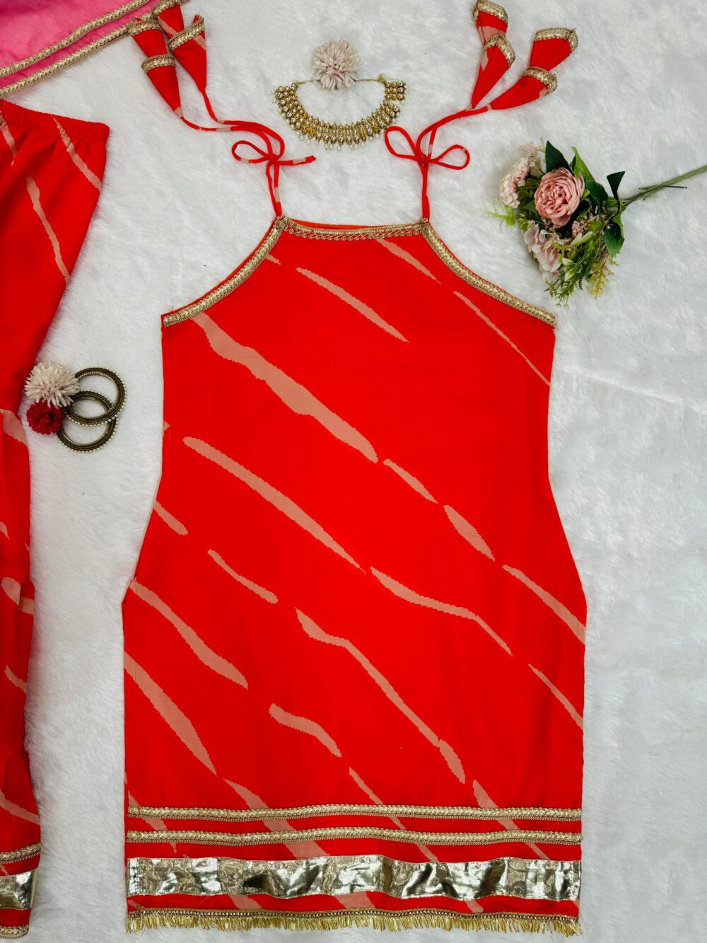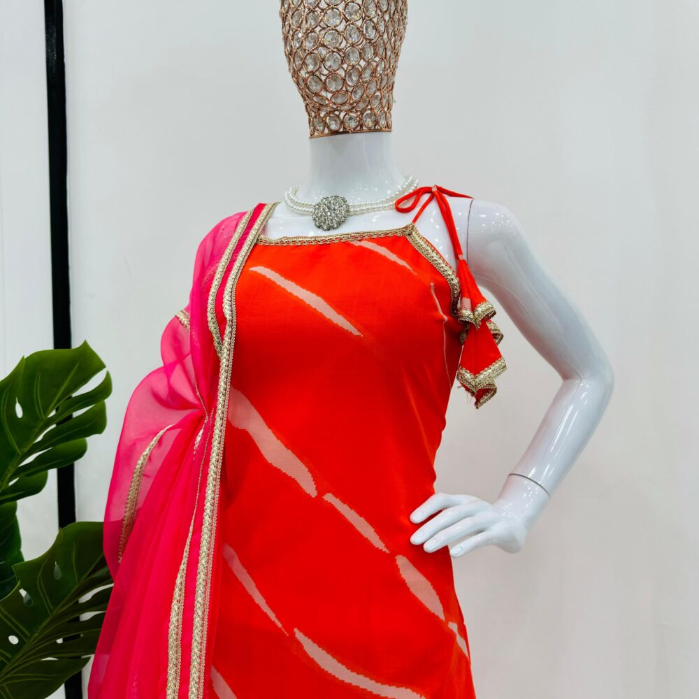 Elevate your ethnic wardrobe with Stylish Faux Georgette Digital Print Orange Color Sharara Set with Organza Dupatta by Ardhaangini, a perfect blend of tradition and contemporary fashion. This elegant ensemble is designed for those who appreciate intricate detailing and high-quality fabrics. The top is crafted from soft faux georgette, lined with a comfortable micro inner, and adorned with a stunning digital print. The addition of a delicate lace border and latkan detailing adds a touch of sophistication, making it ideal for festive occasions and parties.